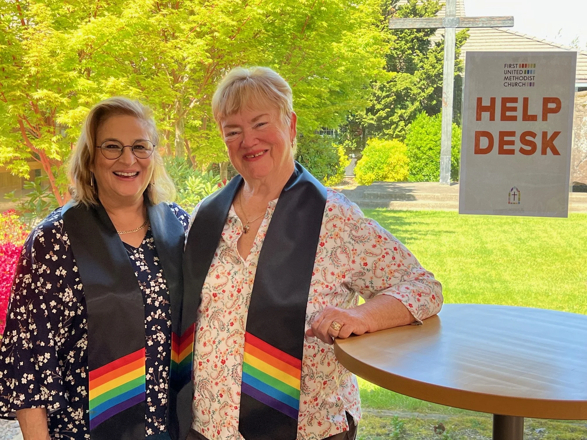 If you have a question about the morning, need to locate a custodian or staff person, want to leave a comment, note, or set up an appointment with a pastor, stop by the Help Desk first. You’ll be able to find them next to the Help Desk sign and wearing a short rainbow stole.